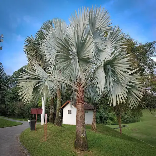 Palem Bismarkia dengan daun yang lebar menciptakan keteduhan dan kenyamanan bagi pengunjung taman atau ruang terbuka.